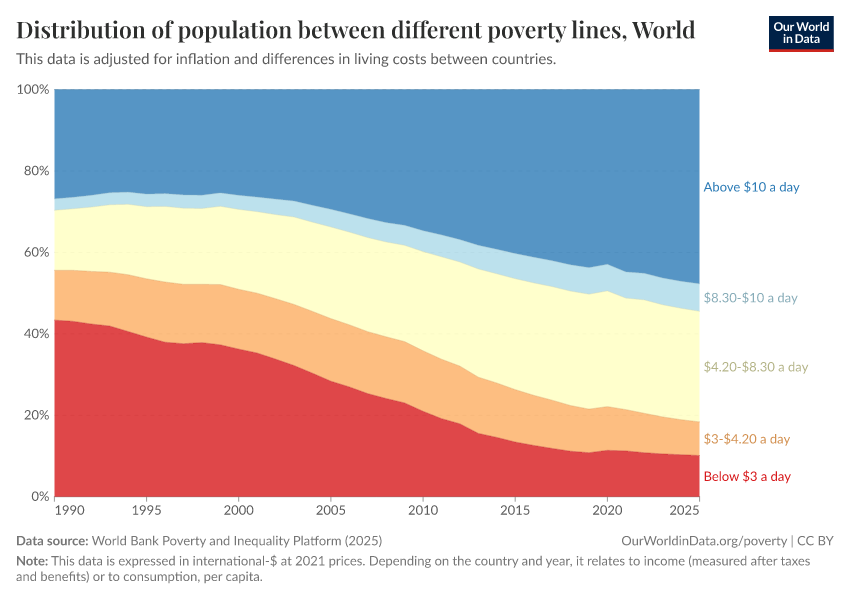 Extreme poverty — indeed a very extreme poverty line — is defined by the “International Poverty Line,” which is living on less than $3 per day. This line is set by the World Bank and used by the UN to monitor extreme poverty worldwide. In these measurements, statisticians adjust for inflation and price differences between countries. You can read more about this adjustment in our article here.