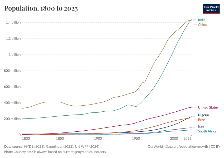 The visualization shows our long-run dataset on population. This provides data on global and regional populations dating back to 1800. In the related chart, you can find these estimates dating back to 10,000 BC.