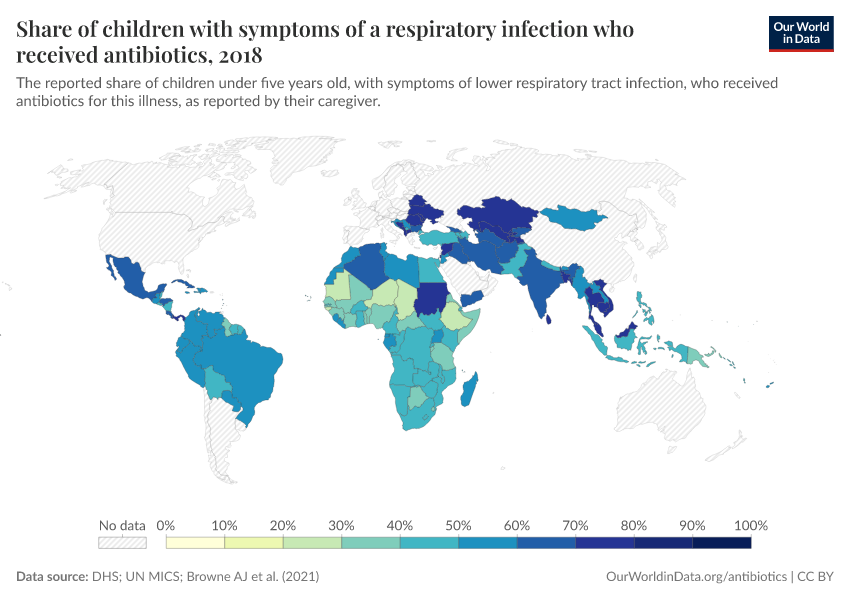 The map below shows the usage of antibiotics to treat children with respiratory infections. Data comes from large-scale surveys such as the DHS and UN MICS.