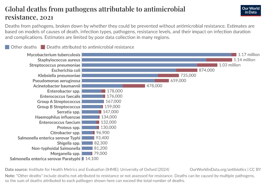 As you can see, deaths caused by antibiotic resistance are most common for bloodstream infections and lower-respiratory infections.