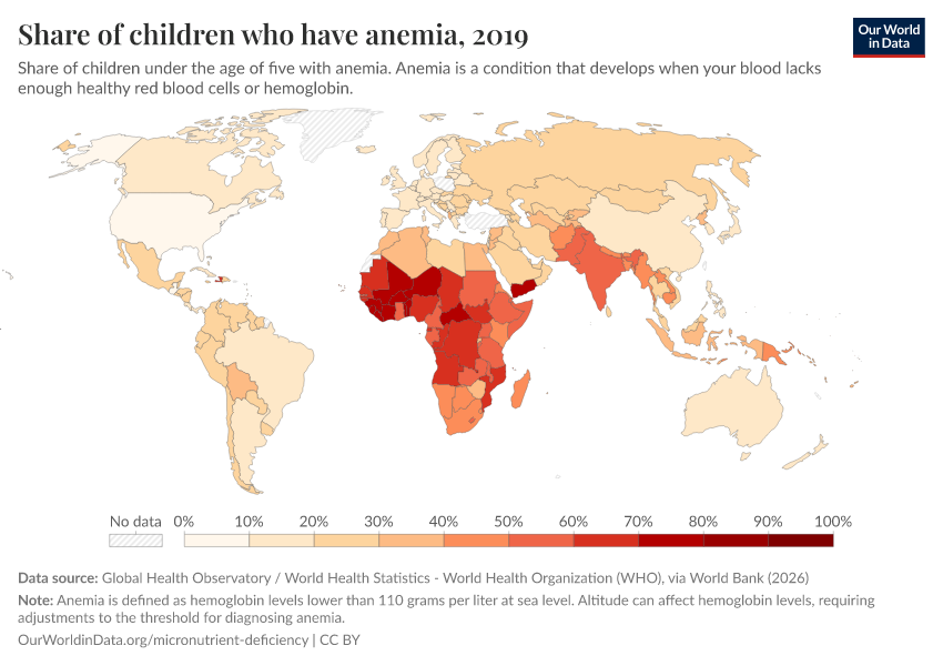 The maps below show the estimated share of children and women of reproductive age who have anemia. It’s much more common in Sub-Saharan Africa and South Asia, where the majority are anemic. But even in richer countries, less than a handful have rates below 10%.