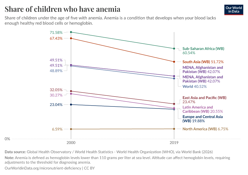 Reductions among children have been slightly more promising: the share of under-fives that are anemic dropped from 48% to 39% between 2000 and 2019.