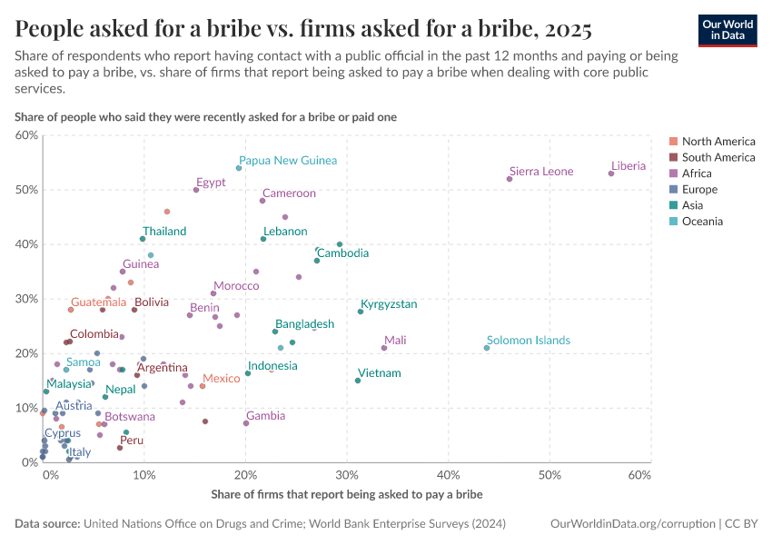 For example, this first chart compares two different surveys on bribery: one of regular citizens, from the United Nations Office on Drugs and Crime, and one of businesses from the World Bank Enterprise Surveys.