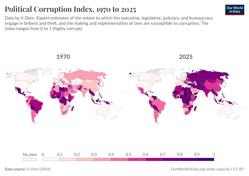 The maps show how V-Dem’s experts assess political corruption in 1970 compared to the present. Experts identify increases in corruption in some countries and decreases in others. You can explore specific countries by switching to the line chart. But, importantly, you should keep in mind that no single measure can fully tell us the story of how corruption changes over time.