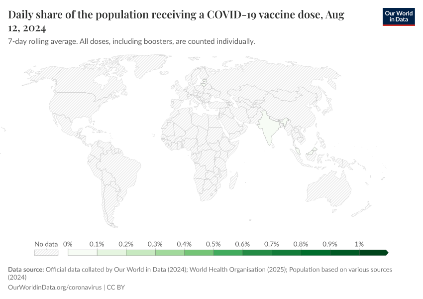 The following chart shows the share of people receiving a COVID-19 vaccine dose. This is shown as a seven-day rolling average.