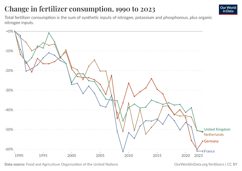 Official governmental statistics — for example, in the UK — confirm the same reduction in fertilizer use.