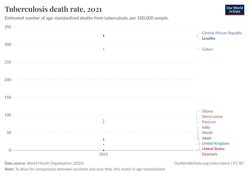 Someone in Lesotho, the Central African Republic, or Gabon is at least 3,000 times more likely to die from TB than someone in the United States or Denmark. You can see these huge differences in death rates in the chart below.