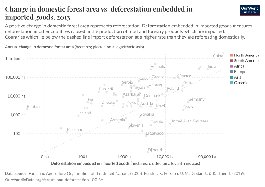 Countries which lie above the grey line – such as the United States, Finland, China – restore more forest each year domestically than they import from elsewhere. For example, the US ‘imported’ 64,000 hectares of deforested land, but increased its domestic forest area by 275,000 hectares. More than four times as much. On balance, they add to the global forest stock.