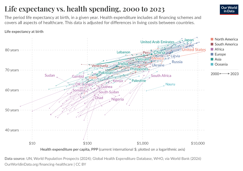 The visualization shows the relationship between life expectancy at birth and healthcare expenditure per capita. This chart shows the level of both measures in the first and last year for which data is available. The arrows connect these two observations, thereby showing the change over time for all countries in the world.
