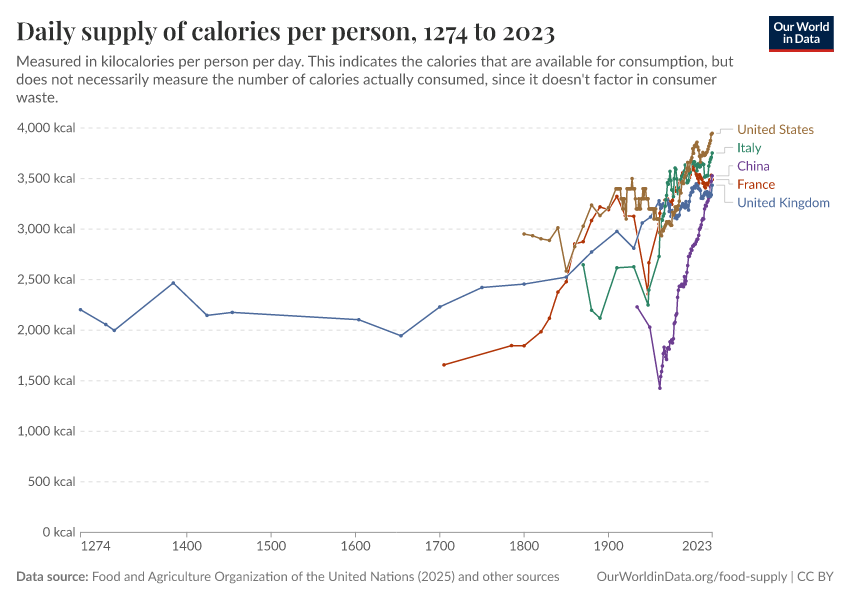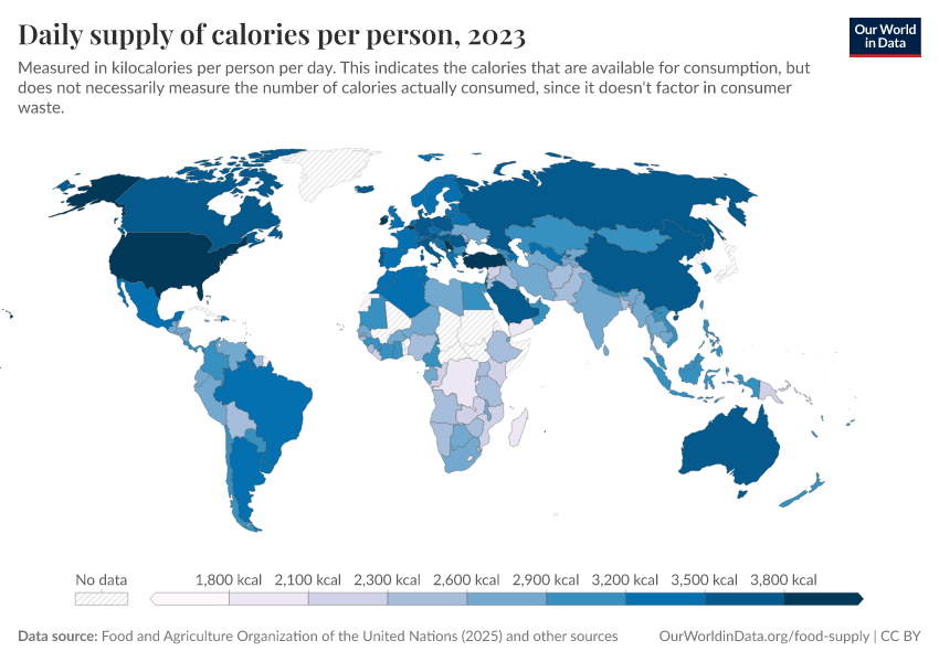 Max Roser, Hannah Ritchie, and Pablo Rosado (2013) - “Food Supply” Published online at OurWorldinData.org. Retrieved from: 'https://select-date-by-typing.owid.pages.dev/food-supply' [Online Resource]BibTeX citation