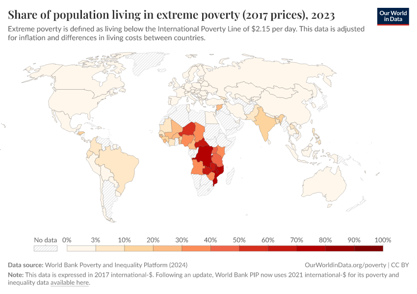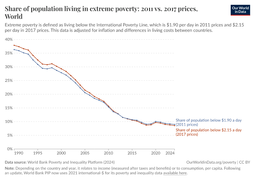 The World Bank has since updated its methods, and now measures incomes in 2021 international-$. As part of these changes, the International Poverty Line used to measure extreme poverty has also been updated: from $1.90 a day (in 2011 prices) to $2.15 a day (in 2017 prices) to $3 a day (in 2021 prices).