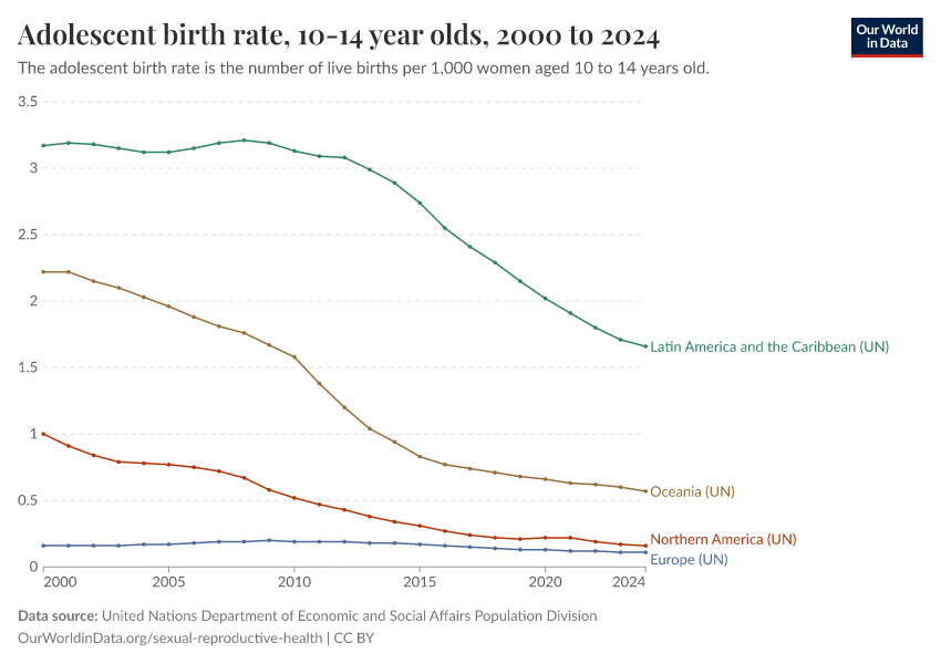 United Nations Department of Economic and Social Affairs Population Division – processed by Our World in Data. “Adolescent birth rate, 10-14 year olds” [dataset]. United Nations Department of Economic and Social Affairs Population Division, “Data from multiple sources” [original data]. Retrieved January 6, 2026 from https://select-date-by-typing.owid.pages.dev/grapher/adolescent-fertility