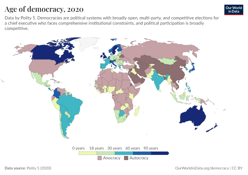 Polity 5 (2020) – processed by Our World in Data. “Age of democracy” [dataset]. Polity 5, “Polity5 Project, Political Regime Characteristics and Transitions, 1800-2018 5” [original data]. Retrieved January 6, 2026 from https://select-date-by-typing.owid.pages.dev/grapher/age-of-democracy-polity