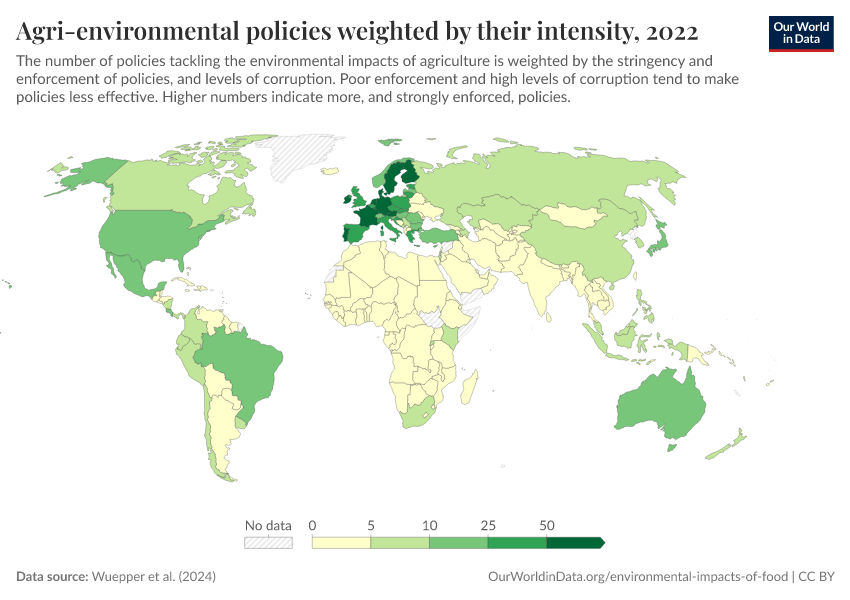 “Data Page: Agri-environmental policies weighted by their intensity”. Our World in Data (2026). Data adapted from Wuepper et al. (2024). Retrieved from https://select-date-by-typing.owid.pages.dev/grapher/agri-environmental-policies-intensity [online resource]How to cite this data