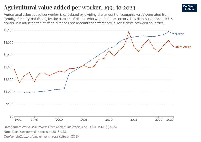 World Bank (World Development Indicators) and ILO (ILOSTAT) (2025) – processed by Our World in Data. “Agricultural value added per worker” [dataset]. World Bank (World Development Indicators) and ILO (ILOSTAT), “World Development Indicators 122” [original data]. Retrieved January 6, 2026 from https://select-date-by-typing.owid.pages.dev/grapher/agriculture-value-added-per-worker-wdi
