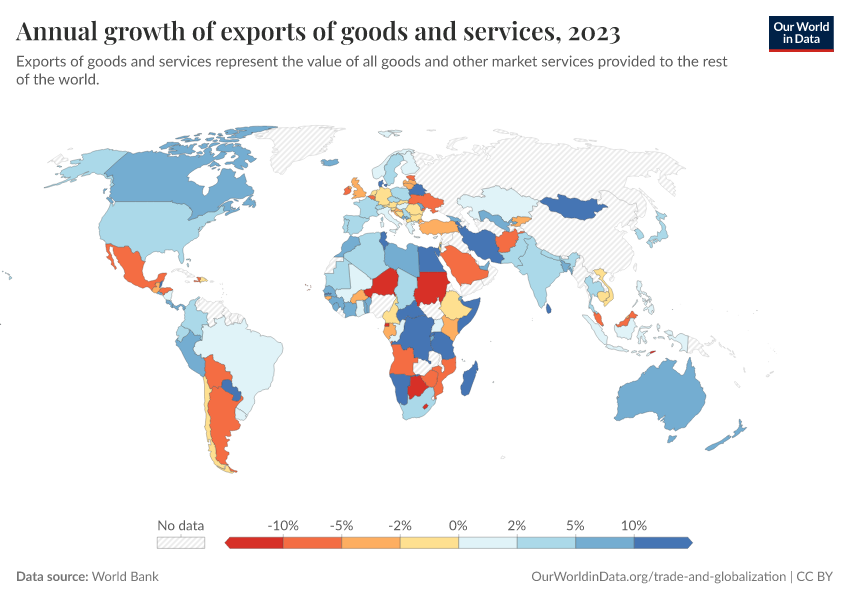 “Data Page: Annual growth of exports of goods and services”. Our World in Data (2026). Data adapted from World Bank. Retrieved from https://select-date-by-typing.owid.pages.dev/grapher/annual-growth-of-exports-of-goods-and-services [online resource]How to cite this data