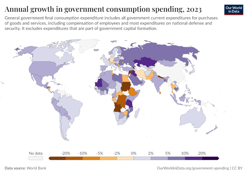 “Data Page: Annual growth in government consumption spending”. Our World in Data (2026). Data adapted from World Bank. Retrieved from https://select-date-by-typing.owid.pages.dev/grapher/annual-growth-of-general-government-final-consumption-expenditure [online resource]How to cite this data