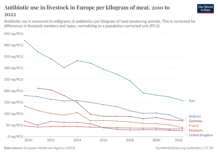 “Data Page: Antibiotic use in livestock in Europe per kilogram of meat”, part of the following publication: Saloni Dattani, Fiona Spooner, Hannah Ritchie, and Max Roser (2024) - “Antibiotics and Antibiotic Resistance”. Data adapted from European Medicines Agency. Retrieved from https://select-date-by-typing.owid.pages.dev/grapher/antibiotic-use-in-livestock-in-europe [online resource]