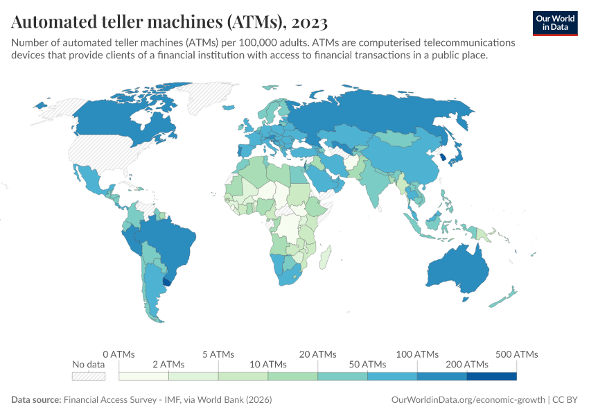 “Data Page: Automated teller machines (ATMs)”. Our World in Data (2026). Data adapted from Financial Access Survey - IMF, via World Bank. Retrieved from https://select-date-by-typing.owid.pages.dev/grapher/automated-teller-machines-atms-per-100000-adults [online resource]How to cite this data