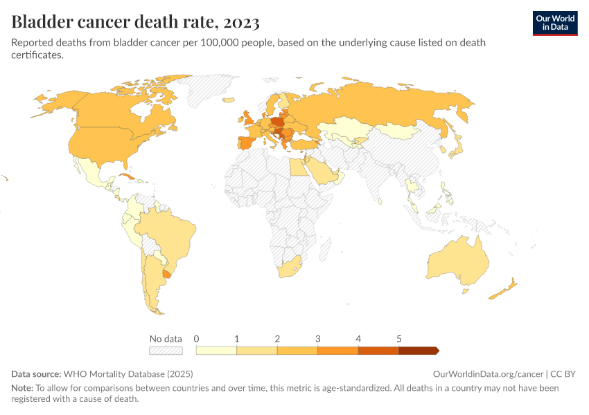 “Data Page: Bladder cancer death rate”, part of the following publication: Saloni Dattani, Fiona Spooner, Hannah Ritchie, and Max Roser (2023) - “Causes of Death”. Data adapted from WHO Mortality Database. Retrieved from https://select-date-by-typing.owid.pages.dev/grapher/bladder-cancer-death-rate [online resource]How to cite this data