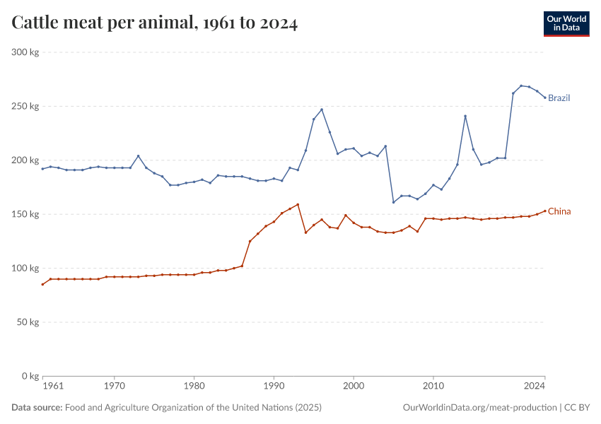Food and Agriculture Organization of the United Nations (2025) – with major processing by Our World in Data. “Cattle meat yield per animal – UN FAO” [dataset]. Food and Agriculture Organization of the United Nations, “Production: Crops and livestock products” [original data]. Retrieved January 6, 2026 from https://select-date-by-typing.owid.pages.dev/grapher/cattle-meat-yields-hectograms-100-grams-per-animal
