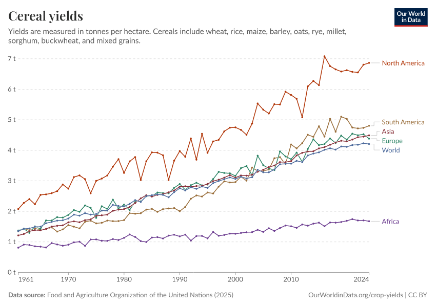 Food and Agriculture Organization of the United Nations (2025) – with major processing by Our World in Data. “Cereal yields – UN FAO” [dataset]. Food and Agriculture Organization of the United Nations, “Production: Crops and livestock products” [original data]. Retrieved January 6, 2026 from https://select-date-by-typing.owid.pages.dev/grapher/cereal-yield