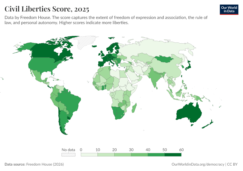 Freedom House (2025) – processed by Our World in Data. “Civil liberties score” [dataset]. Freedom House, “Freedom in the World” [original data]. Retrieved January 6, 2026 from https://select-date-by-typing.owid.pages.dev/grapher/civil-liberties-score-fh
