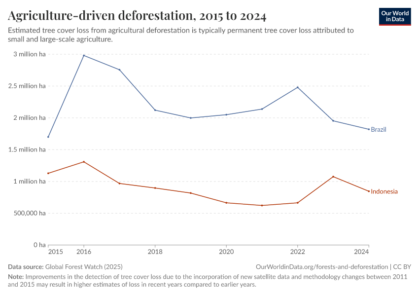 “Data Page: Agriculture-driven deforestation”, part of the following publication: Hannah Ritchie, Fiona Spooner, and Max Roser (2021) - “Forests and Deforestation”. Data adapted from Global Forest Watch. Retrieved from https://select-date-by-typing.owid.pages.dev/grapher/commodity-driven-deforestation [online resource]