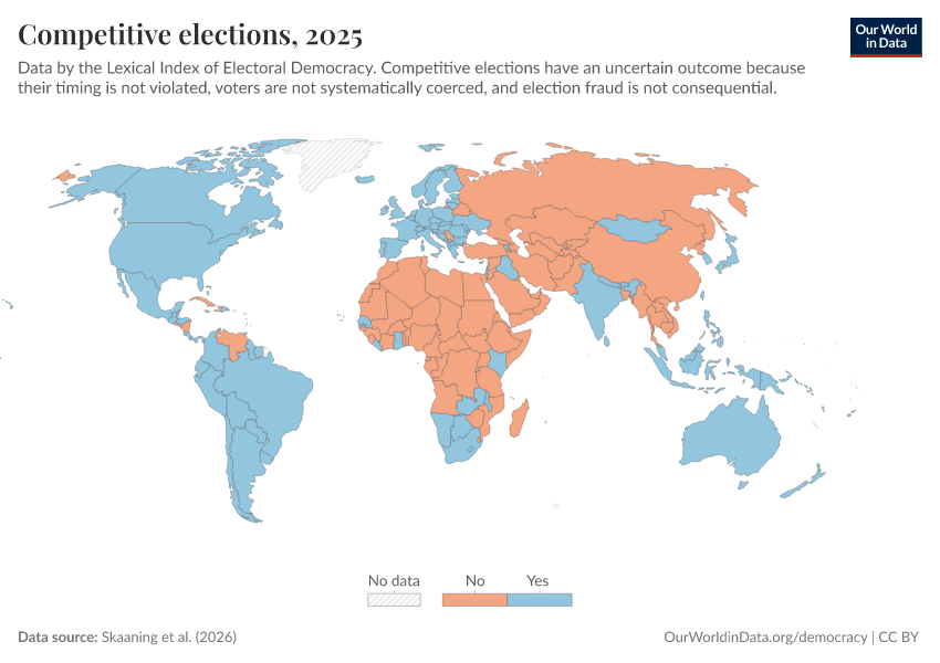 Skaaning et al. (2025) – processed by Our World in Data. “Competitive elections” [dataset]. Skaaning et al., “Lexical Index of Electoral Democracy (LIED) v6.8” [original data]. Retrieved January 6, 2026 from https://select-date-by-typing.owid.pages.dev/grapher/competitive-elections-lexical
