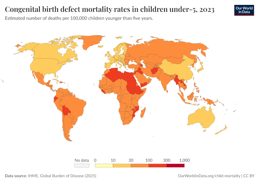 IHME, Global Burden of Disease (2024) – with minor processing by Our World in Data. “Congenital birth defect mortality rates in children under-5” [dataset]. IHME, Global Burden of Disease, “Global Burden of Disease - Deaths and DALYs” [original data]. Retrieved January 6, 2026 from https://select-date-by-typing.owid.pages.dev/grapher/congenital-birth-defect-mortality-rates-in-children-under-5