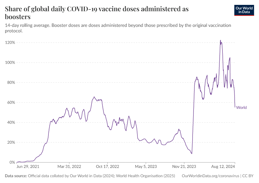Official data collated by Our World in Data (2024); World Health Organisation (2025) – with major processing by Our World in Data. “Share of global daily COVID-19 vaccine doses administered as boosters” [dataset]. Official data collated by Our World in Data, “COVID-19, vaccinations”; World Health Organisation, “COVID-19, vaccinations (WHO)” [original data]. Retrieved January 6, 2026 from https://select-date-by-typing.owid.pages.dev/grapher/covid-vaccine-share-boosters