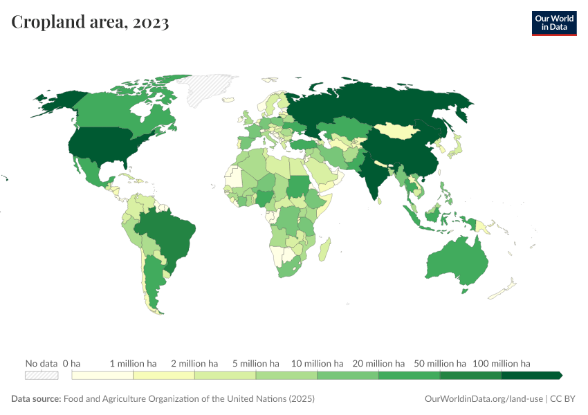 “Data Page: Cropland area”, part of the following publication: Hannah Ritchie, Pablo Rosado, and Max Roser (2023) - “Agricultural Production”. Data adapted from Food and Agriculture Organization of the United Nations. Retrieved from https://select-date-by-typing.owid.pages.dev/grapher/cropland-area [online resource]