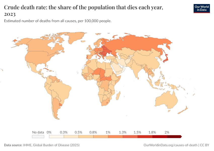 IHME, Global Burden of Disease (2024) – with minor processing by Our World in Data. “Crude death rate: the share of the population that dies each year” [dataset]. IHME, Global Burden of Disease, “Global Burden of Disease - Deaths and DALYs” [original data]. Retrieved January 6, 2026 from https://select-date-by-typing.owid.pages.dev/grapher/crude-death-rate-the-share-of-the-population-that-dies-each-year-gbd