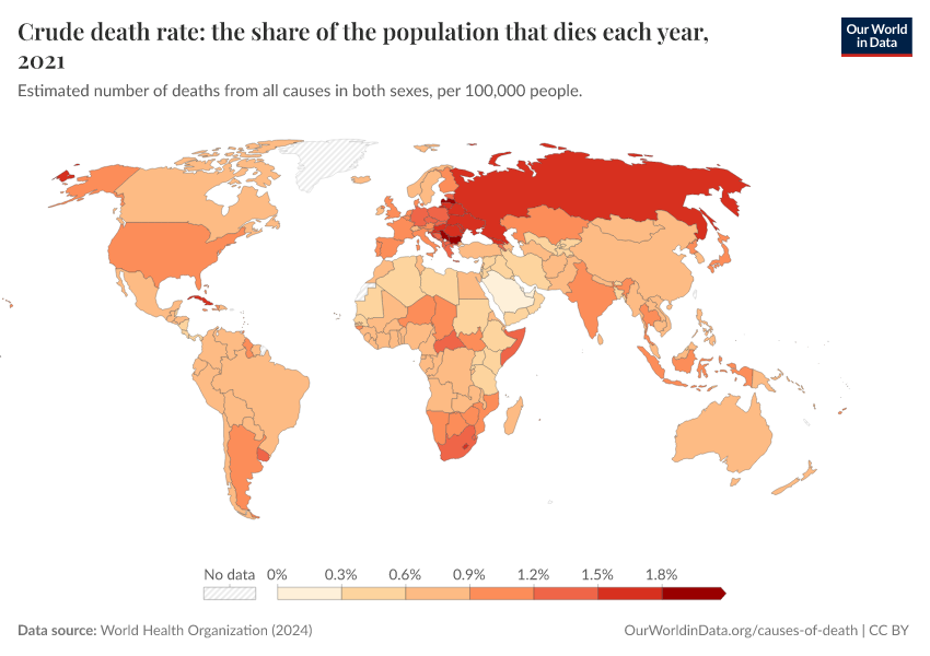World Health Organization (2024) – with major processing by Our World in Data. “Crude death rate: the share of the population that dies each year” [dataset]. World Health Organization, “Global Health Estimates” [original data]. Retrieved January 6, 2026 from https://select-date-by-typing.owid.pages.dev/grapher/crude-death-rate-the-share-of-the-population-that-dies-each-year-who