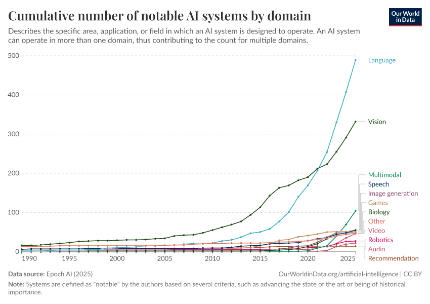 Epoch AI (2025) – with major processing by Our World in Data. “Cumulative number of notable AI systems by domain” [dataset]. Epoch AI, “Parameter, Compute and Data Trends in Machine Learning” [original data]. Retrieved January 6, 2026 from https://select-date-by-typing.owid.pages.dev/grapher/cumulative-number-of-notable-ai-systems-by-domain