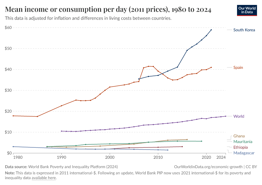 World Bank Poverty and Inequality Platform (2024) – with major processing by Our World in Data. “Mean income or consumption per day (2011 prices) – World Bank” [dataset]. World Bank Poverty and Inequality Platform, “World Bank Poverty and Inequality Platform (PIP) 20240627_2017, 20240627_2011” [original data]. Retrieved January 6, 2026 from https://select-date-by-typing.owid.pages.dev/grapher/daily-mean-income-2011-ppp