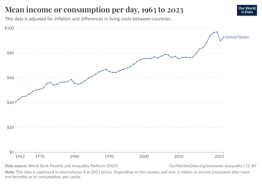 World Bank Poverty and Inequality Platform (2025) – with major processing by Our World in Data. “Mean income or consumption per day – World Bank” [dataset]. World Bank Poverty and Inequality Platform, “World Bank Poverty and Inequality Platform (PIP) 20250930_2021, 20250930_2017” [original data]. Retrieved January 6, 2026 from https://select-date-by-typing.owid.pages.dev/grapher/daily-mean-income