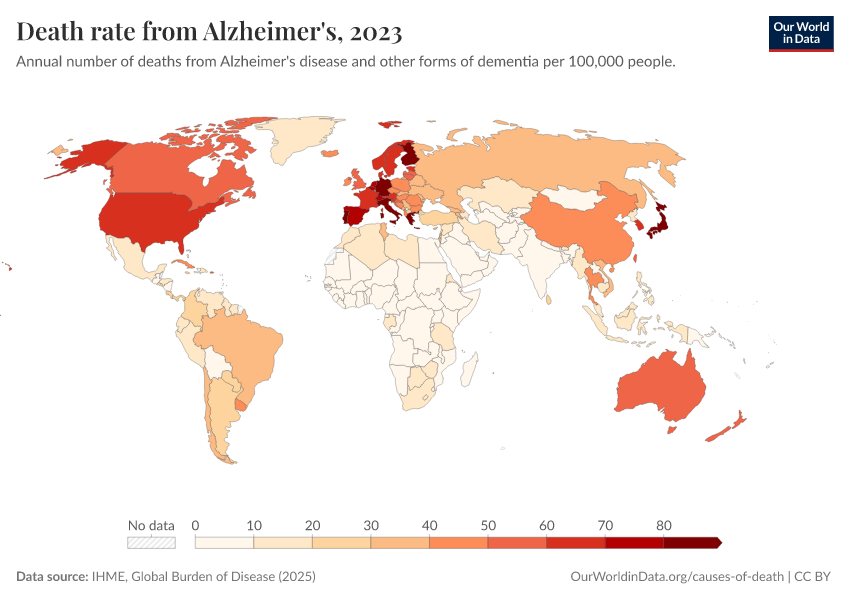 IHME, Global Burden of Disease (2024) – with minor processing by Our World in Data. “Death rate from Alzheimer's” [dataset]. IHME, Global Burden of Disease, “Global Burden of Disease - Deaths and DALYs” [original data]. Retrieved January 6, 2026 from https://select-date-by-typing.owid.pages.dev/grapher/death-rate-from-alzheimers-other-dementias-gbd