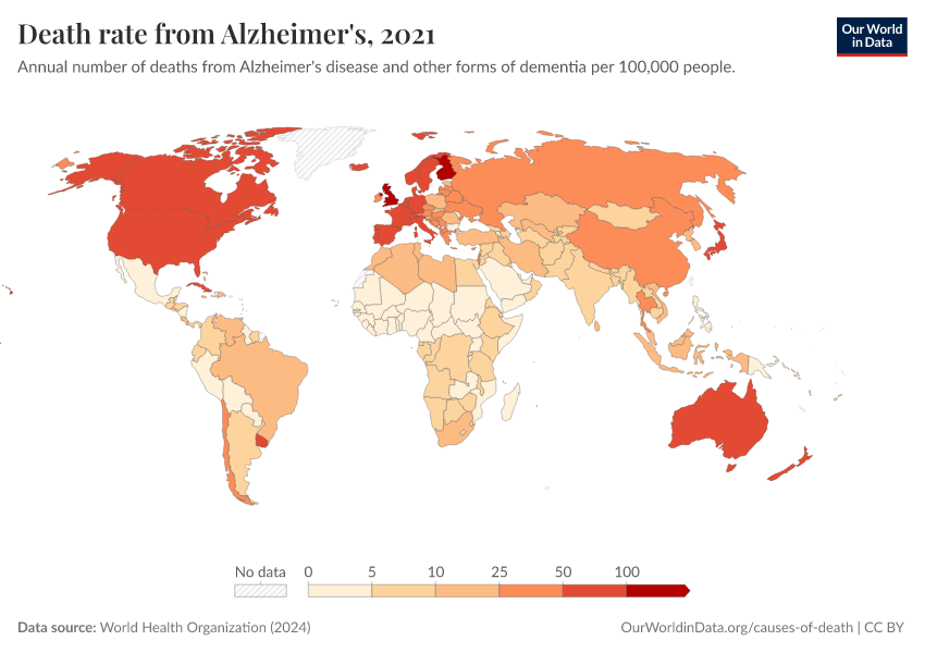 World Health Organization (2024) – with major processing by Our World in Data. “Death rate from Alzheimer's” [dataset]. World Health Organization, “Global Health Estimates” [original data]. Retrieved January 6, 2026 from https://select-date-by-typing.owid.pages.dev/grapher/death-rate-from-alzheimers-other-dementias-ghe
