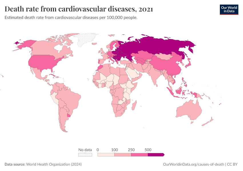 World Health Organization (2024) – with major processing by Our World in Data. “Death rate from cardiovascular diseases” [dataset]. World Health Organization, “Global Health Estimates” [original data]. Retrieved January 6, 2026 from https://select-date-by-typing.owid.pages.dev/grapher/death-rate-from-cardiovascular-disease-ghe