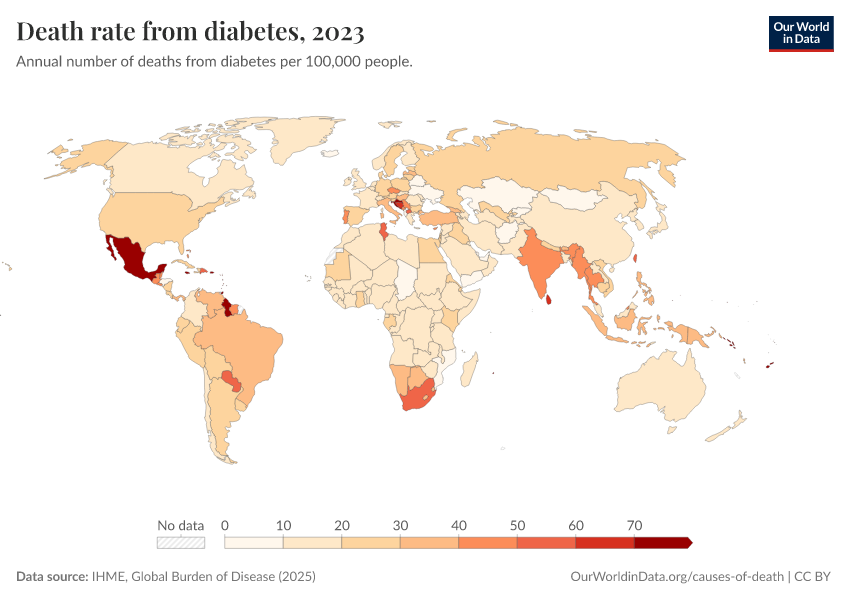 IHME, Global Burden of Disease (2024) – with minor processing by Our World in Data. “Death rate from diabetes” [dataset]. IHME, Global Burden of Disease, “Global Burden of Disease - Deaths and DALYs” [original data]. Retrieved January 6, 2026 from https://select-date-by-typing.owid.pages.dev/grapher/death-rate-from-diabetes-gbd