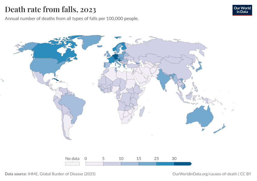 “Data Page: Death rate from falls”, part of the following publication: Esteban Ortiz-Ospina and Max Roser (2016) - “Global Health”. Data adapted from IHME, Global Burden of Disease. Retrieved from https://select-date-by-typing.owid.pages.dev/grapher/death-rate-from-falls-gbd-rate [online resource]How to cite this data