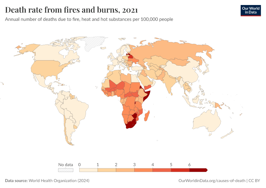 World Health Organization (2024) – with major processing by Our World in Data. “Death rate from fires and burns” [dataset]. World Health Organization, “Global Health Estimates” [original data]. Retrieved January 6, 2026 from https://select-date-by-typing.owid.pages.dev/grapher/death-rate-from-fires-and-burns-who
