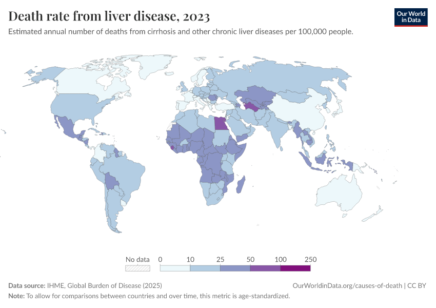 IHME, Global Burden of Disease (2024) – with minor processing by Our World in Data. “Death rate from liver disease” [dataset]. IHME, Global Burden of Disease, “Global Burden of Disease - Deaths and DALYs” [original data]. Retrieved January 6, 2026 from https://select-date-by-typing.owid.pages.dev/grapher/death-rate-from-liver-disease