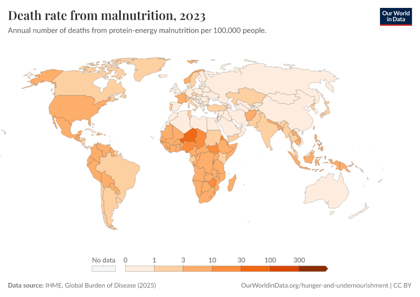 IHME, Global Burden of Disease (2024) – with minor processing by Our World in Data. “Death rate from malnutrition” [dataset]. IHME, Global Burden of Disease, “Global Burden of Disease - Deaths and DALYs” [original data]. Retrieved January 6, 2026 from https://select-date-by-typing.owid.pages.dev/grapher/death-rate-from-malnutrition