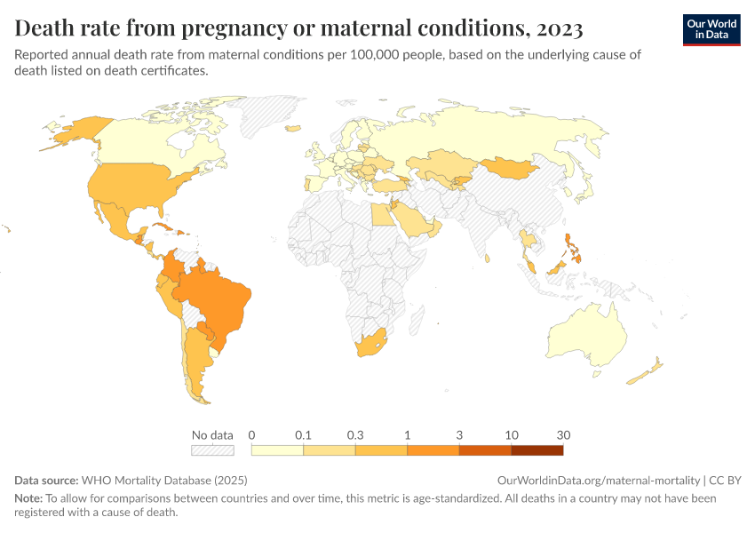 WHO Mortality Database (2025) – with minor processing by Our World in Data. “Death rate from pregnancy or maternal conditions” [dataset]. WHO Mortality Database, “WHO Mortality Database” [original data]. Retrieved January 6, 2026 from https://select-date-by-typing.owid.pages.dev/grapher/death-rate-from-maternal-disorders
