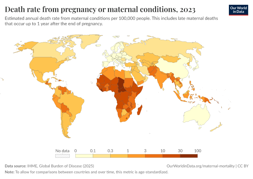 IHME, Global Burden of Disease (2024) – with minor processing by Our World in Data. “Death rate from pregnancy or maternal conditions” [dataset]. IHME, Global Burden of Disease, “Global Burden of Disease - Deaths and DALYs” [original data]. Retrieved January 6, 2026 from https://select-date-by-typing.owid.pages.dev/grapher/death-rate-from-maternal-disorders-ihme