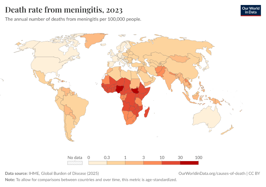 IHME, Global Burden of Disease (2024) – with minor processing by Our World in Data. “Death rate from meningitis” [dataset]. IHME, Global Burden of Disease, “Global Burden of Disease - Deaths and DALYs” [original data]. Retrieved January 6, 2026 from https://select-date-by-typing.owid.pages.dev/grapher/death-rate-from-meningitis