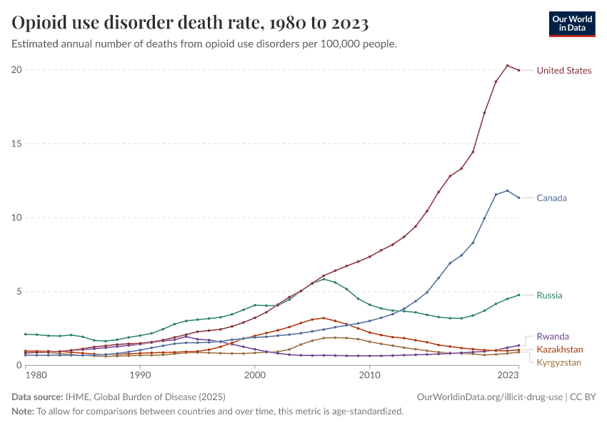 IHME, Global Burden of Disease (2024) – with minor processing by Our World in Data. “Opioid use disorder death rate” [dataset]. IHME, Global Burden of Disease, “Global Burden of Disease - Deaths and DALYs” [original data]. Retrieved January 6, 2026 from https://select-date-by-typing.owid.pages.dev/grapher/death-rate-from-opioid-use