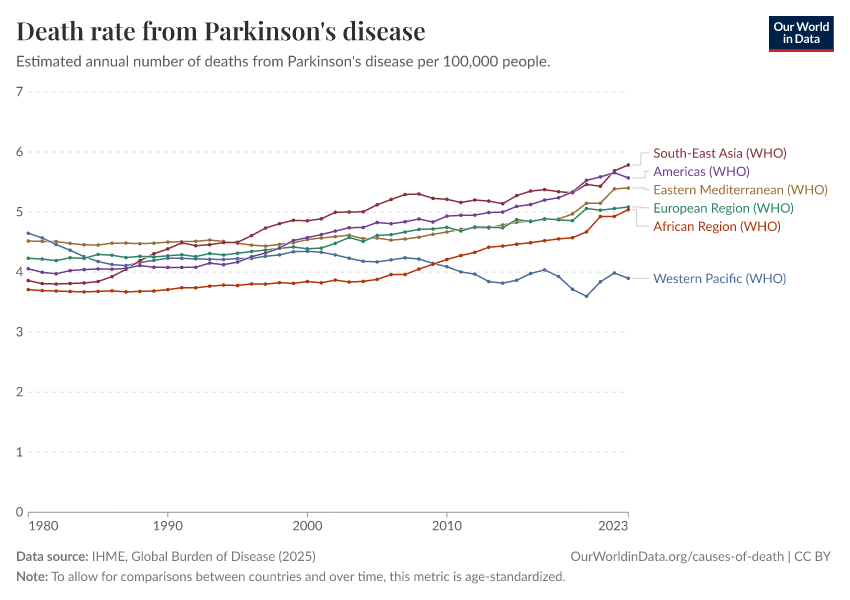 IHME, Global Burden of Disease (2024) – with minor processing by Our World in Data. “Death rate from Parkinson's disease” [dataset]. IHME, Global Burden of Disease, “Global Burden of Disease - Deaths and DALYs” [original data]. Retrieved January 6, 2026 from https://select-date-by-typing.owid.pages.dev/grapher/death-rate-from-parkinsons-disease